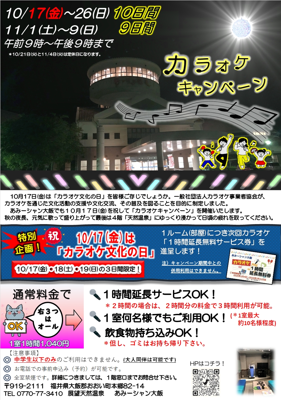 日頃よりあみーシャン大飯をご利用いただき誠にありがとうございます。あみーシャン大飯でも10/17(金)の「カラオケ文化の日」を記念して3日間限定で特別企画を開催!ご利用のお客様に「次回1時間延長サービス券」を1ルームにつき1枚プレゼントいたします やっと暑い夏が過ぎ、涼しくなってきたこの季節、快適なカラオケルームをご利用ください。気持ち良く歌ったあと、もしくは歌の最中、または歌う前に、皆様のお好みで4階の天然温泉と合わせてご利用ください。皆様のご予約とご利用をお待ち致しております。