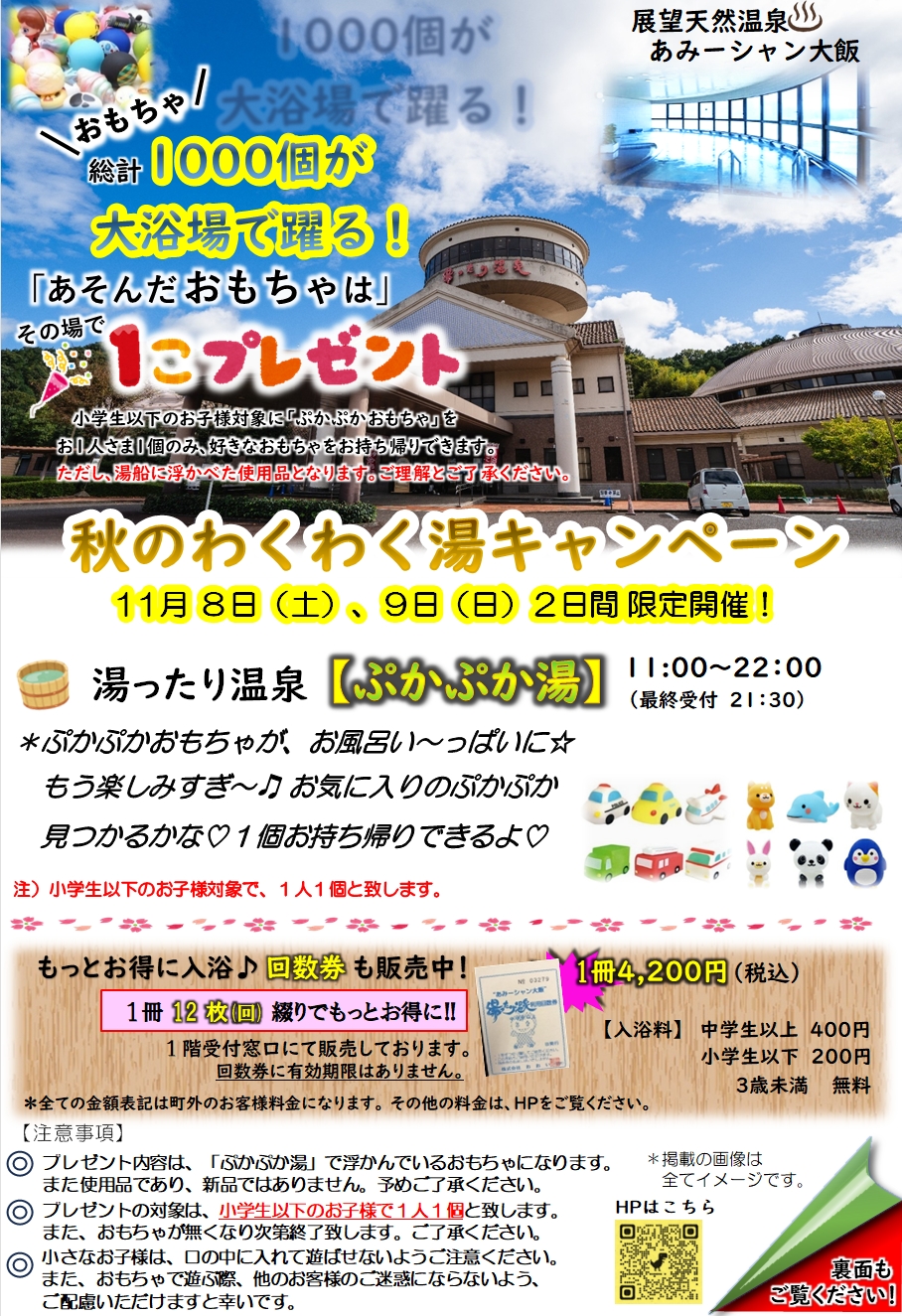 あみーシャン大飯から皆様へこの秋お贈りする年内最大級のイベントがやってまいりました!「ぷかぷかおもちゃ」を約1,000個突破させ、今シーズン最終営業8日、9日の2日間限定で大開催!音をピーっと鳴らして遊ぶのもヨシ!水鉄砲にして遊ぶのもヨシ!(*まわりのご迷惑にならない程度にお遊びください)かわいく並べ積み上げて遊ぶのもヨシ!お子様とご一緒に圧巻の「わくわく湯」ぜひお楽しみください。なんと!遊んだお気に入りのおもちゃは1個プレゼント♪皆様のお越しお待ちいたしております。