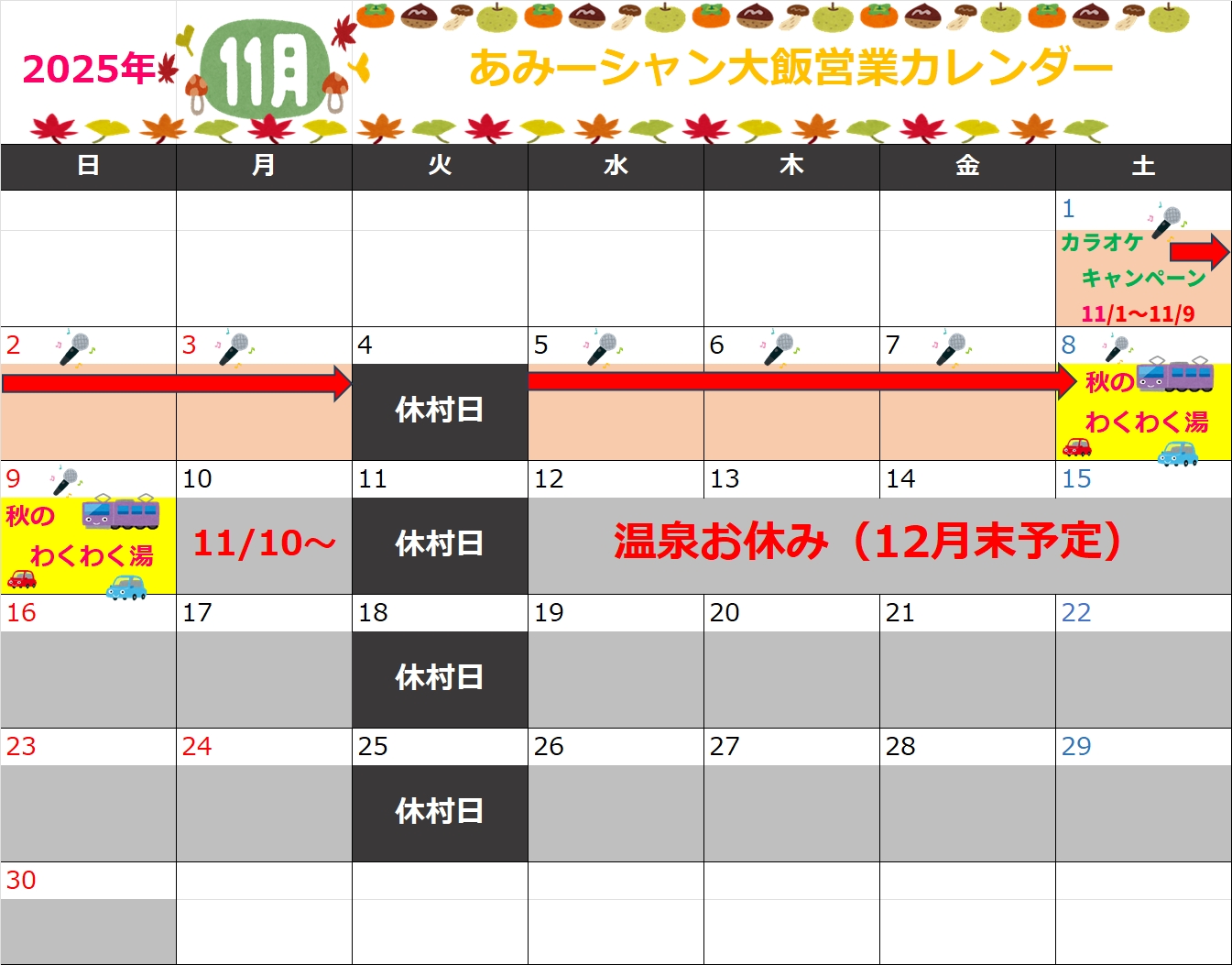 あみーシャン大飯 2025年 11月の営業カレンダー 2025年11月の営業カレンダーになります。 11月10日(月)から12月末まで「ゆったり温泉」を臨時休業致します。 今年も残すところ短い温泉営業期間になりますが皆様のご利用をお待ちいたしております。
