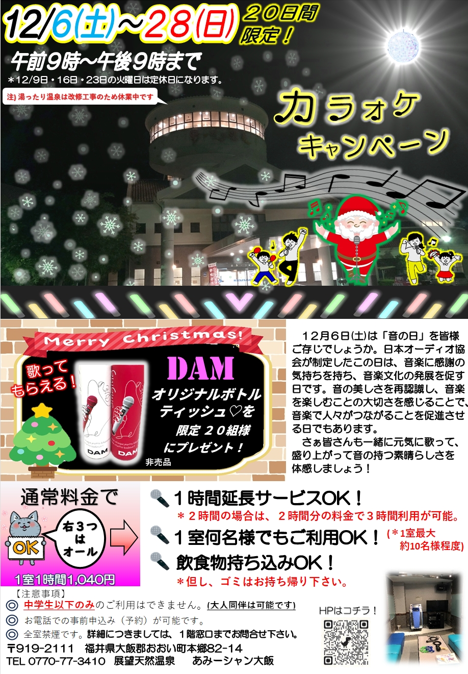 本年も残りわずかの営業期間となりましたが、たくさんのお客様にご利用いただけたこと心より感謝申し上げます。あみーシャン大飯から皆様へ感謝の気持ちを込めて、今回のキャンペーンに加えて「DAM オリジナルボトルティッシュ」を特別にプレゼントいたします。使用後は、もちろん市販のティッシュを詰め替えられ、再使用が可能。また、持ち運びにカバンやあらゆるドリンクホルダーに収納でき、使いたいときすぐ取り出せて便利♪先着20組様限定です。今年最後のカラオケの締めは、あみーシャン大飯をぜひご利用ください。 皆様のご予約とご利用をお待ちいたしております。