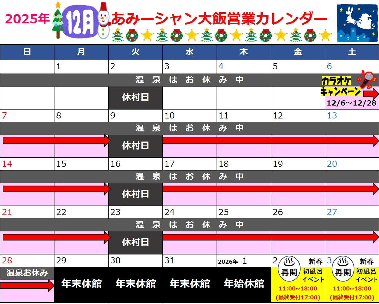 あみーシャン大飯 2025年 12月分の営業カレンダー