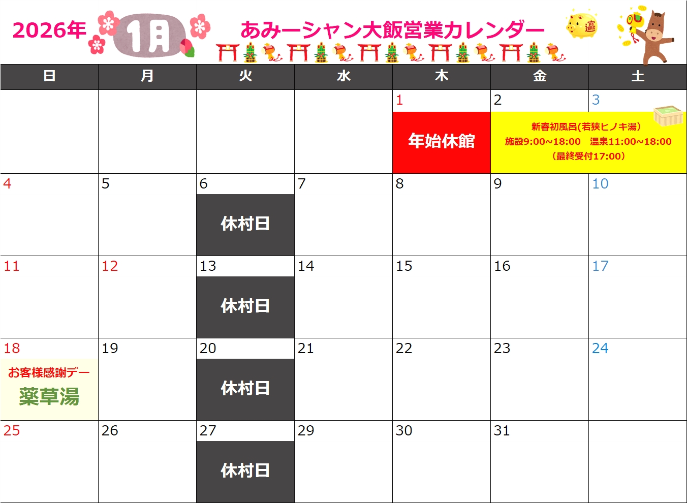 あみーシャン大飯 2026年 1月分の営業カレンダー