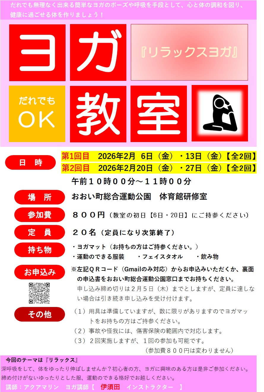 ヨガ教室開催のお知らせ(令和8年2月開催)
