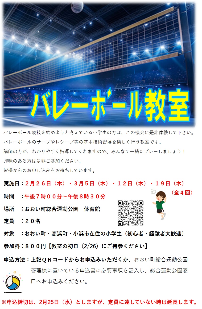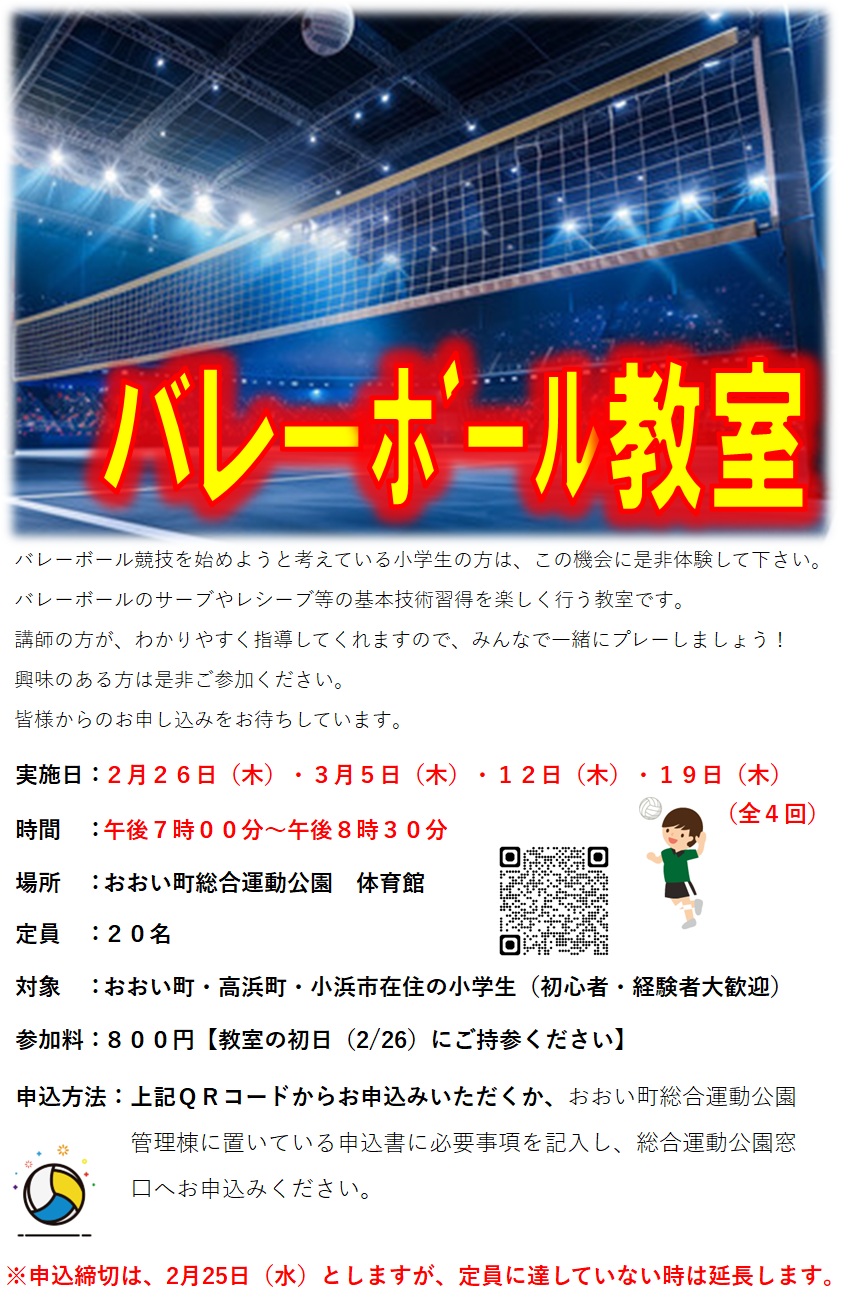 バレーボール教室開催のお知らせ【2月26日(木)~3月19日(木)毎週木曜日】